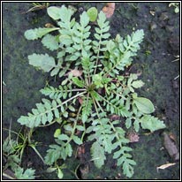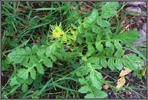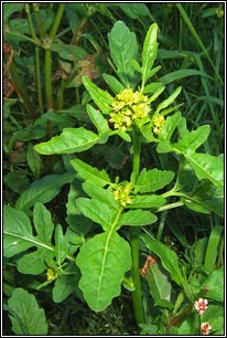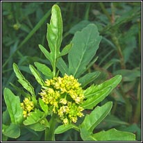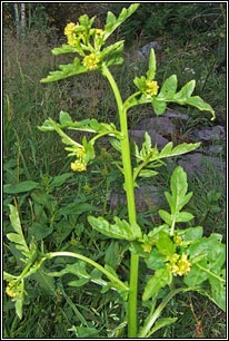 Marsh Yellow-cress Small pale-yellow flowers, petals equal or shorter than sepals. Fruit more/less equal to stalk, swollen, curved, contracted into short style. Shorter than fruit of Creeping Yellow-cress (R.sylvestris). Lower leaves pinnately-lobed, toothed lobes, hairless. Stem leaves unstalked. Height: to 50cm. Habitat: Damp, bare ground, winter-flooded. Colonist of wetland sites. Also damp paths, tracks. Found throughout Ireland. Native.
